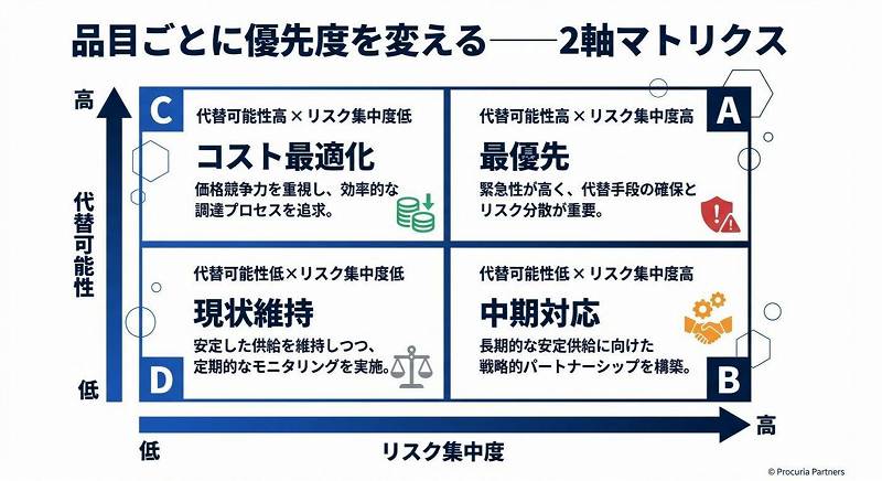 3. 全品目を一律に分散しようとするな。代替可能性×リスク集中度の2×2マトリクスで品目を仕分け、A象限から優先対応する。